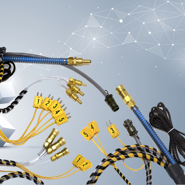 Cáp dây rốn được sản xuất có các khớp nối nhanh đực và cái, đầu kết nối sensor nhiệt độ Thermocouple Type K, cáp dẫn nguồn 4 pin, đường dẫn khí và dây đỡ thẳng.